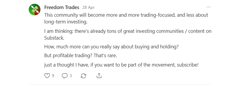 I’ve spent hours reading their analyses and realized I’m the one learning from them. At the same time, I’ve discovered I’m much more excited to write about trading, a topic you never really figure out completely. By nature, you’re bound to make mistakes, and that’s exactly what drives growth.