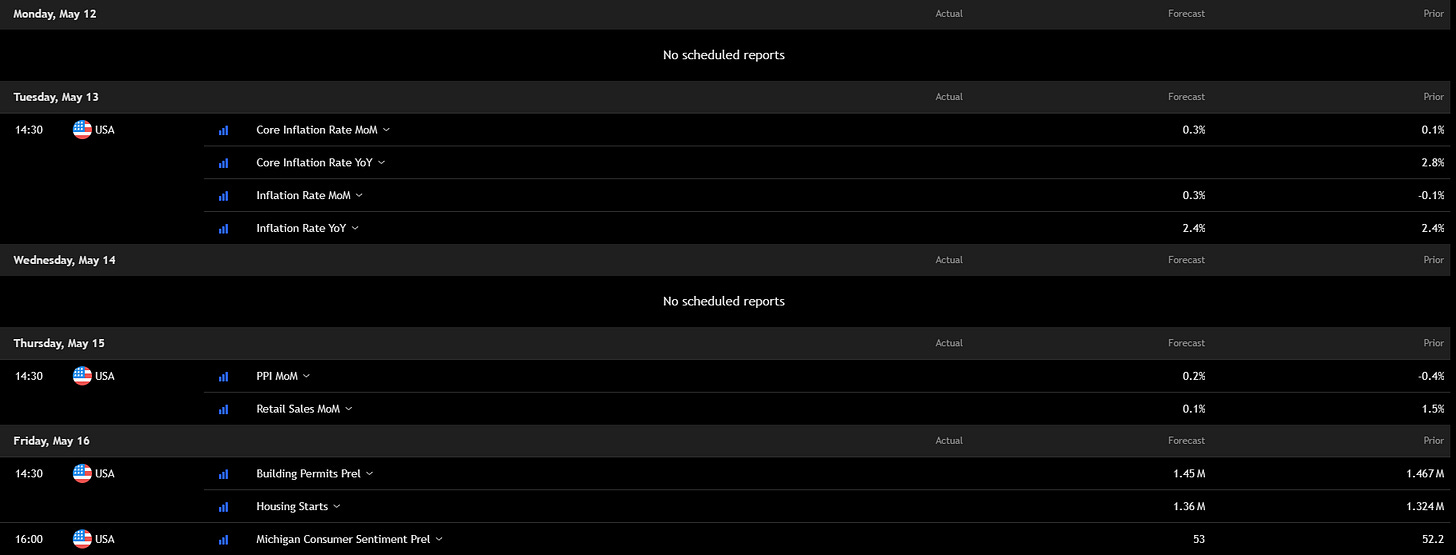 Big week ahead for US markets. Tuesday’s CPI data (core + headline) will set the tone, 0.3% MoM expected, any surprise will shake equities and bonds hard. Thursday brings PPI and Retail Sales, both critical for the inflation narrative. Friday wraps with Housing and Michigan Sentiment.