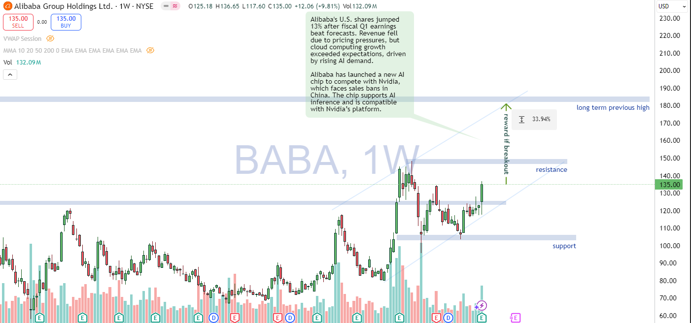 BABA, in the medium term (a few weeks), could retest that resistance and then break out toward the $150 zone, thanks to the catalyst that Alibaba has launched a new AI chip to compete with Nvidia, which faces sales bans in China. The chip supports AI inference and is compatible with Nvidia’s platform ++ the strong earnings report.