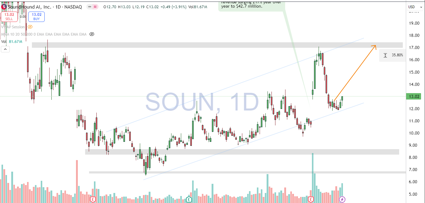 All of August, it has been trading in a $15–16 range, and it looks ready to explode. If that trendline holds, we could see a 32% move and even more if it reaches the next resistance line at $30.