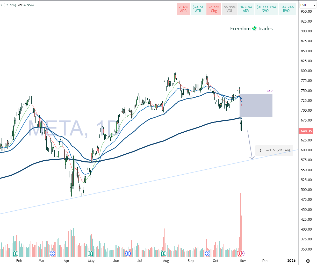 The way I’d play META is by waiting for it to form a consolidation base and seeing if it starts making higher lows and reclaims the 200 EMA line, that’s where I’d start buying.