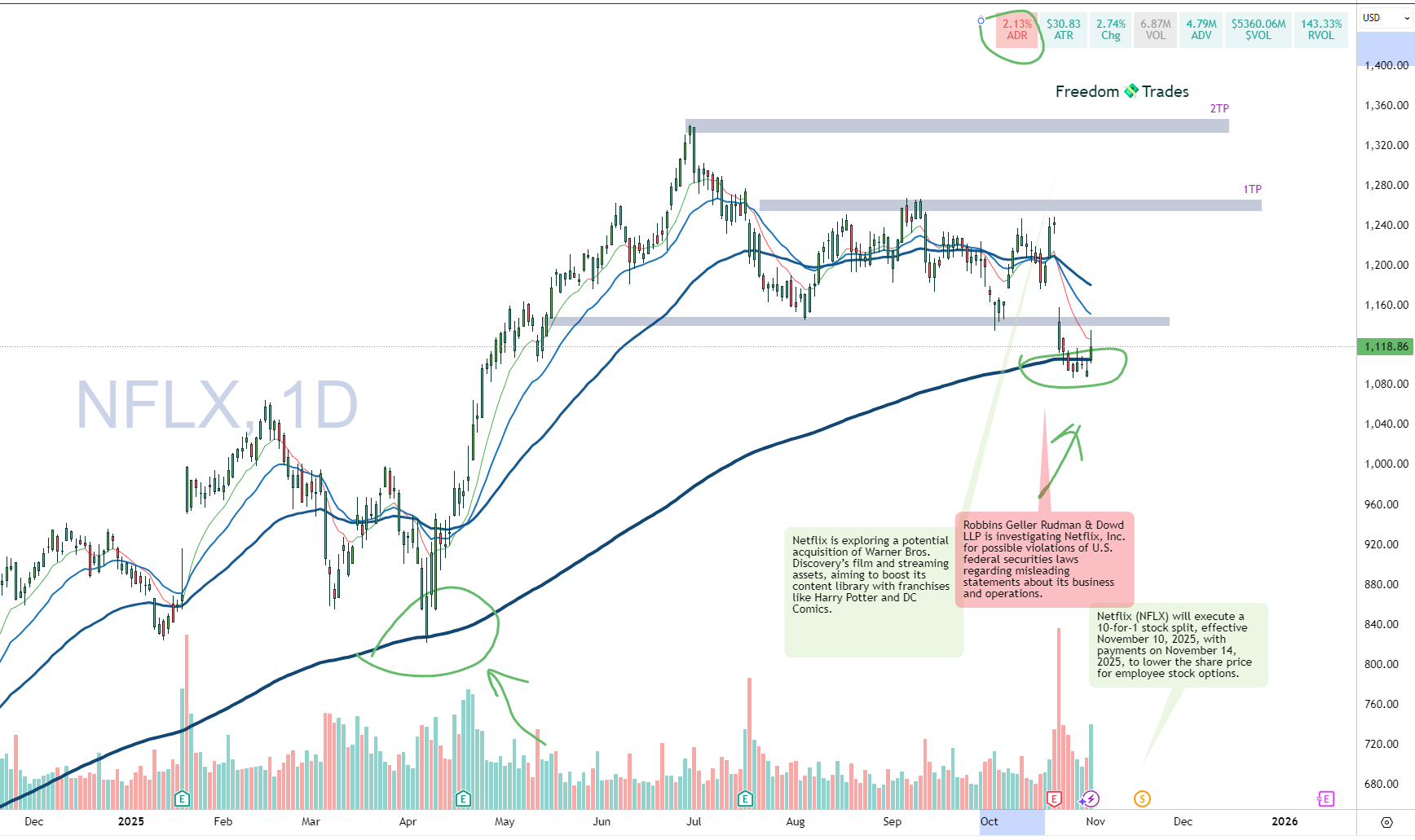 If we look at the most recent times when Netflix dropped below or touched the 200 EMA, we can see that it didn’t stay there for long. This was the case in April 2025, August 2024, and even October 2023.
