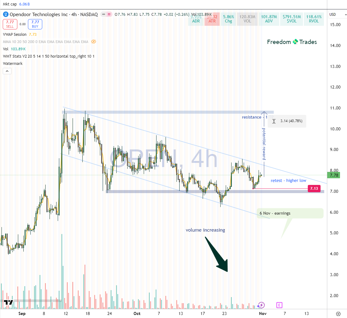 OPEN is forming a descending wedge breakout on the 4H chart, a bullish reversal pattern.