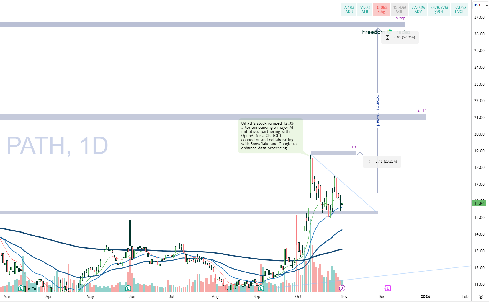 PATH is coiling inside a bullish flag pattern after a sharp 12% move on AI partnership news.