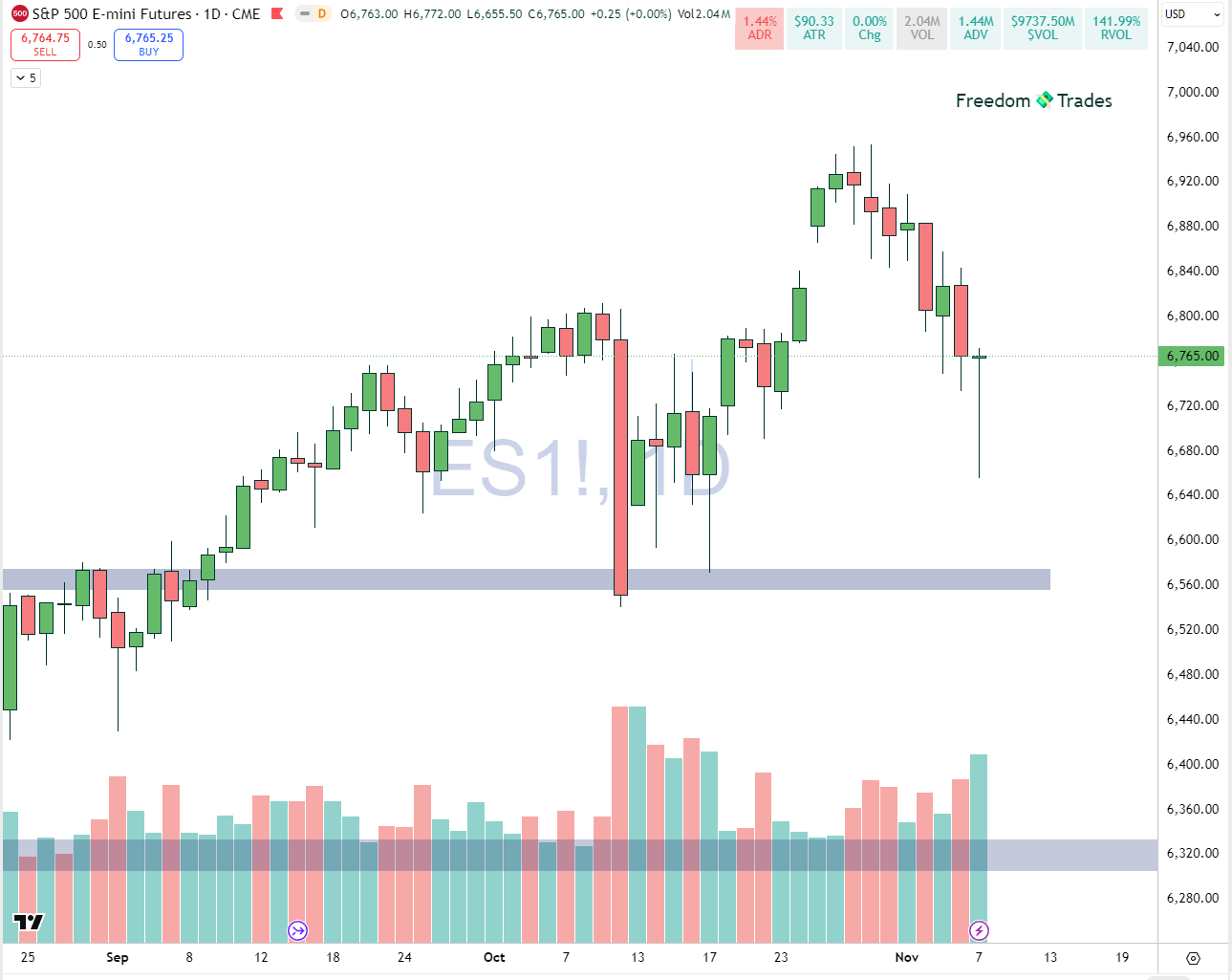 Looking at the overall market, especially ES (S&P 500 futures), Friday closed strong after printing a fresh low around $6,656.