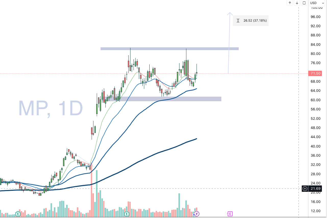 I believe this is the month when MP will attempt a second leg up to break above the previous all-time high of $82. As you can see, it failed the first time and formed a double top on the daily chart.