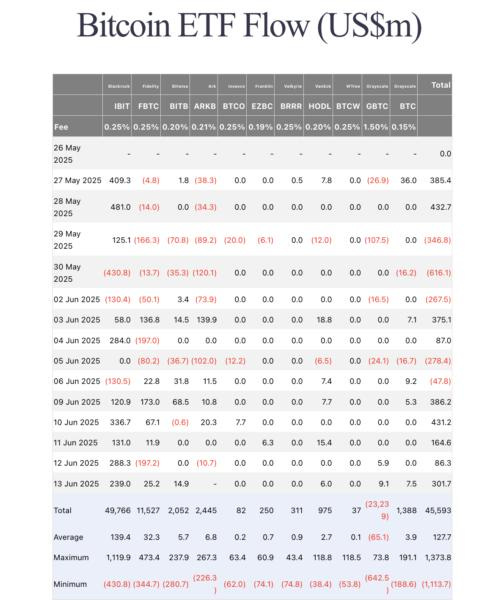 For five straight days, from June 9 to June 13, Bitcoin ETFs recorded over $1.3 billion in inflows, according to Farside Investors.