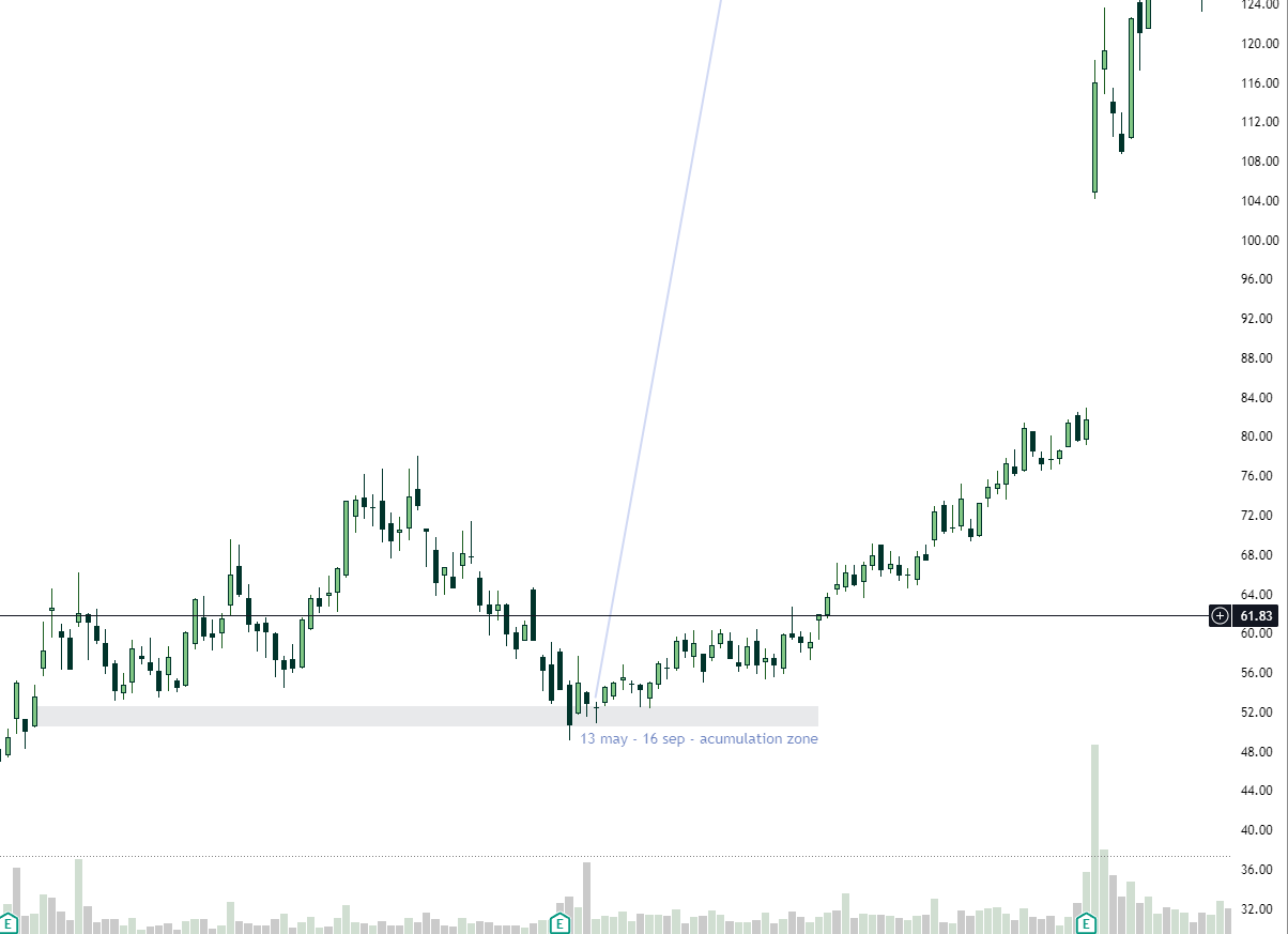 It wasn’t just the volume that made me buy, it was also the fact that between May 13 and September 16, the price held that new high beautifully and formed a clear accumulation zone.