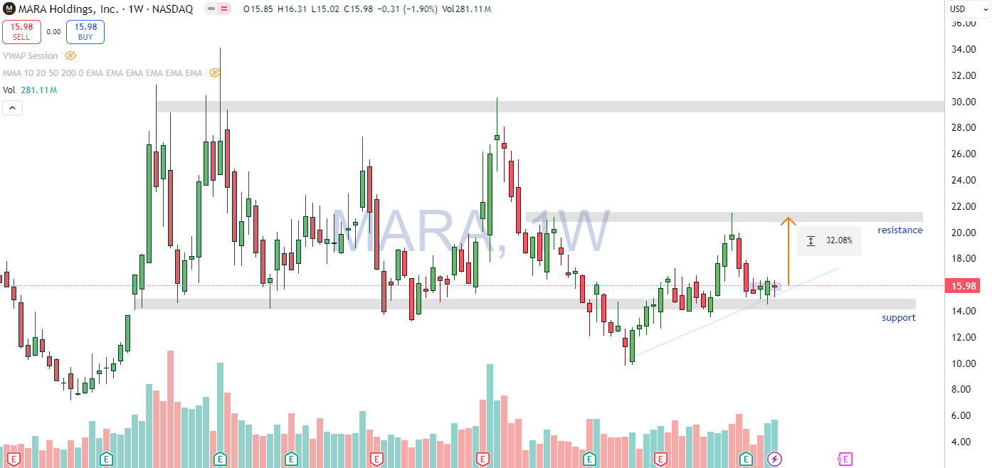 MARA looks good, but it will only move if we see another wave of hype from the crypto market, and right now BTC is in a -13% pullback from its ATH. If we see strength in BTC, MARA could be a better play.