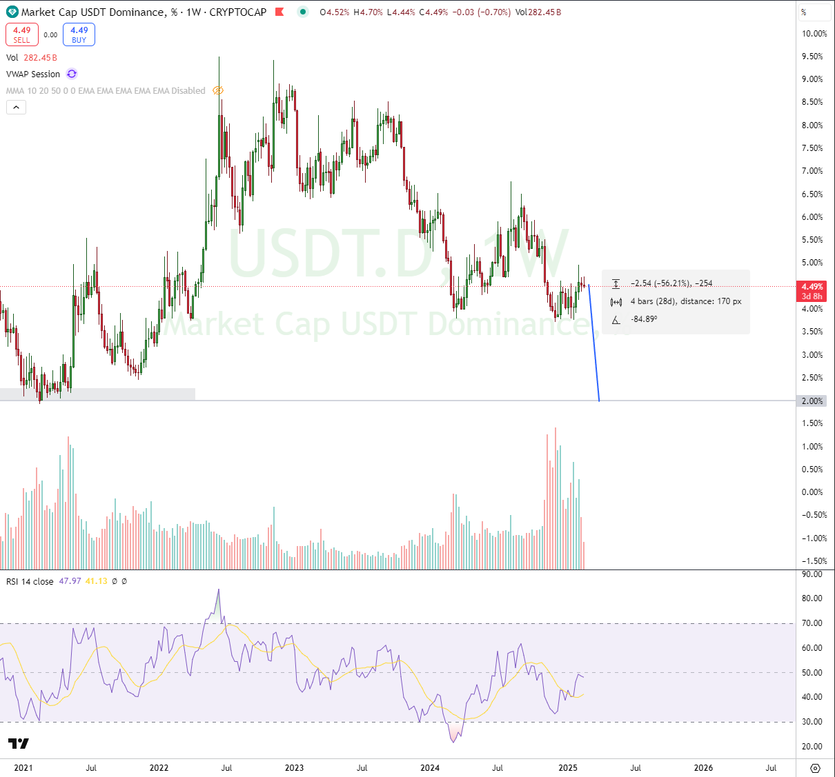 It is currently at 4.49%. And if USDT.D were to drop to 2.00% (as it was in the last bull run), that would mean a 56% decrease.