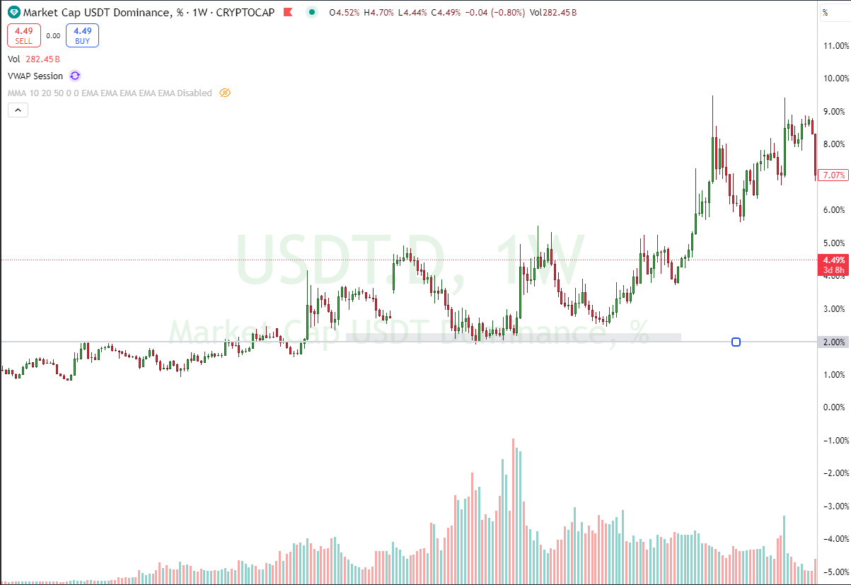 And then we take this chart and compare it with the USDT.D dominance, which looks like this: