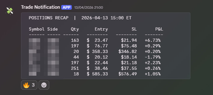 On top of that, the bot also sends a daily end-of-day recap of my positions, so you know exactly which ones I’m still in and which ones I’ve exited.