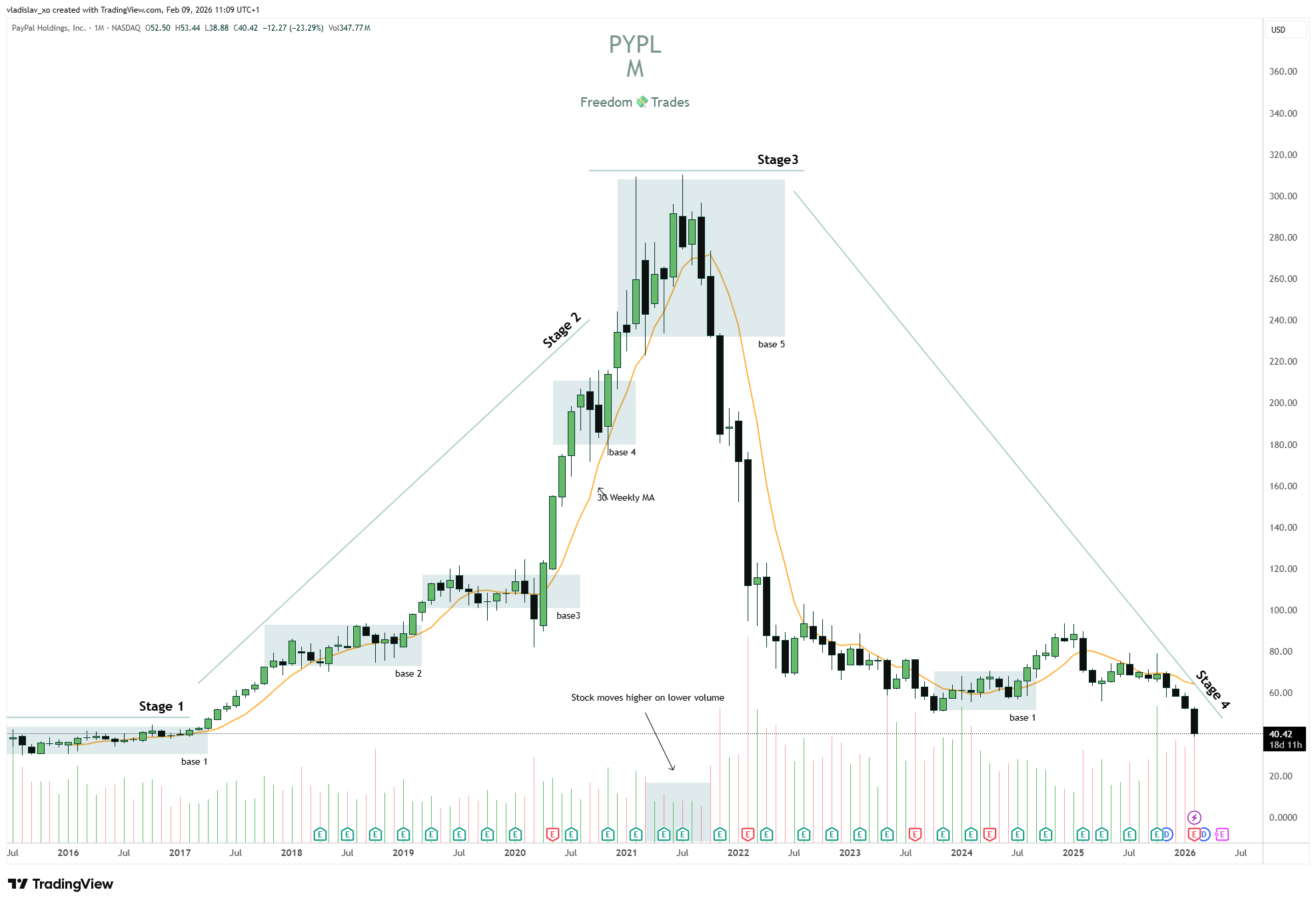 Do not try to buy before the transition to Stage 2. These stocks can stay for months, even years, in Stage 4 or Stage 1 (check $PYPL if you don’t believe me). You don’t want to be stuck in a position for years on end.