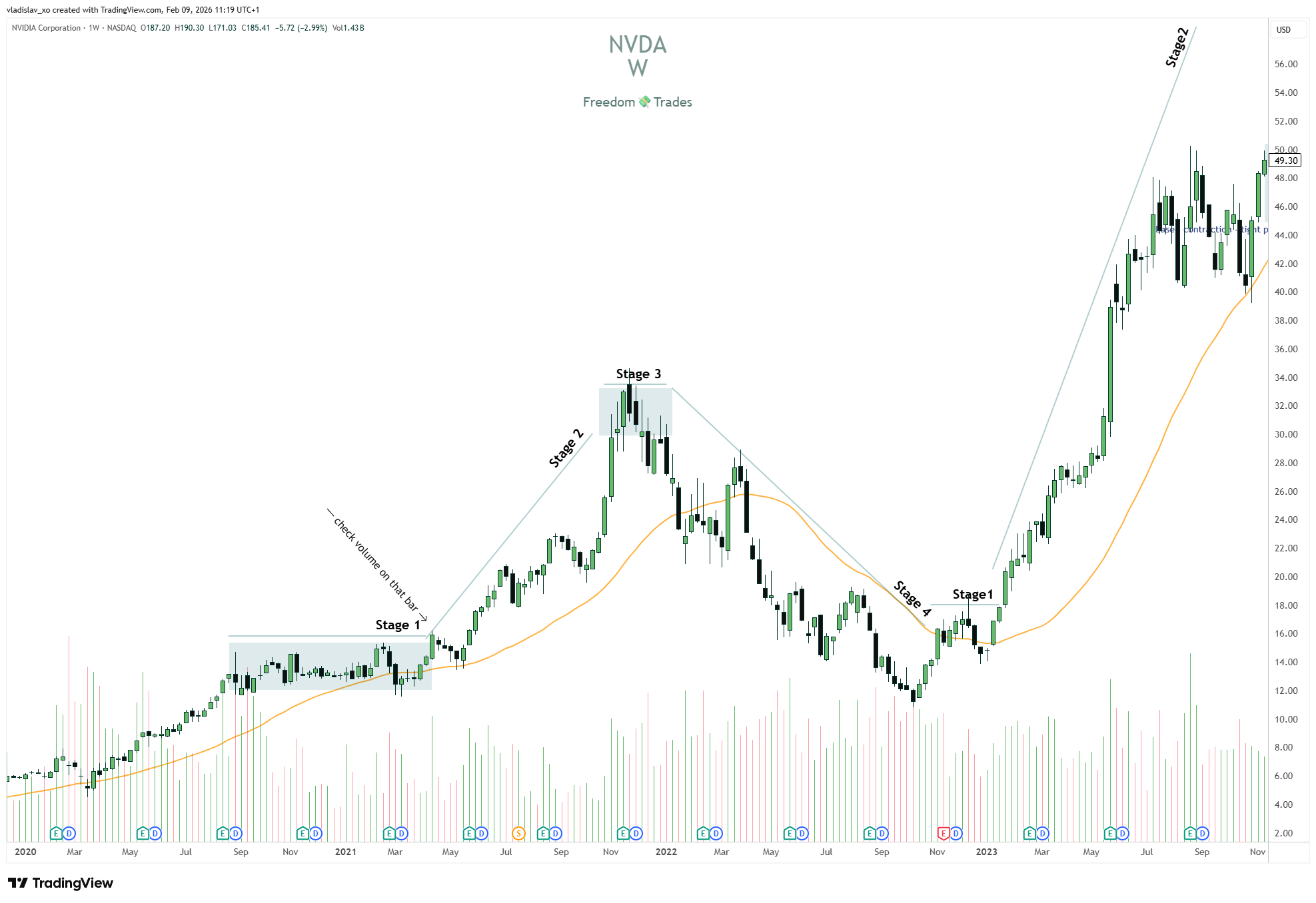 These concepts were established thanks to Stan Weinstein. If you want to read more about Stage Analysis, I highly recommend reading his book.