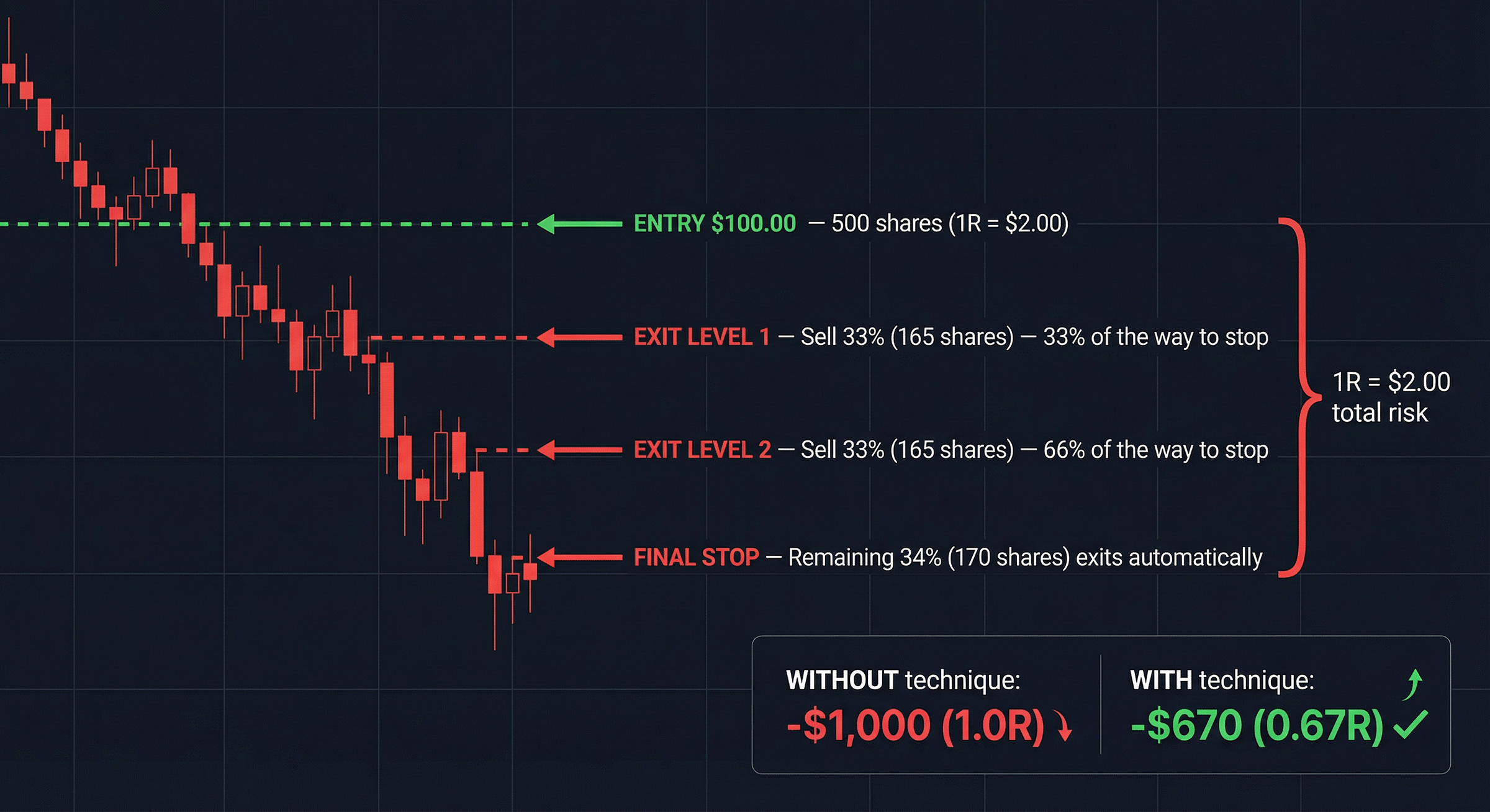Level 1: Price drops 33% toward your stop, sell 33% of your position