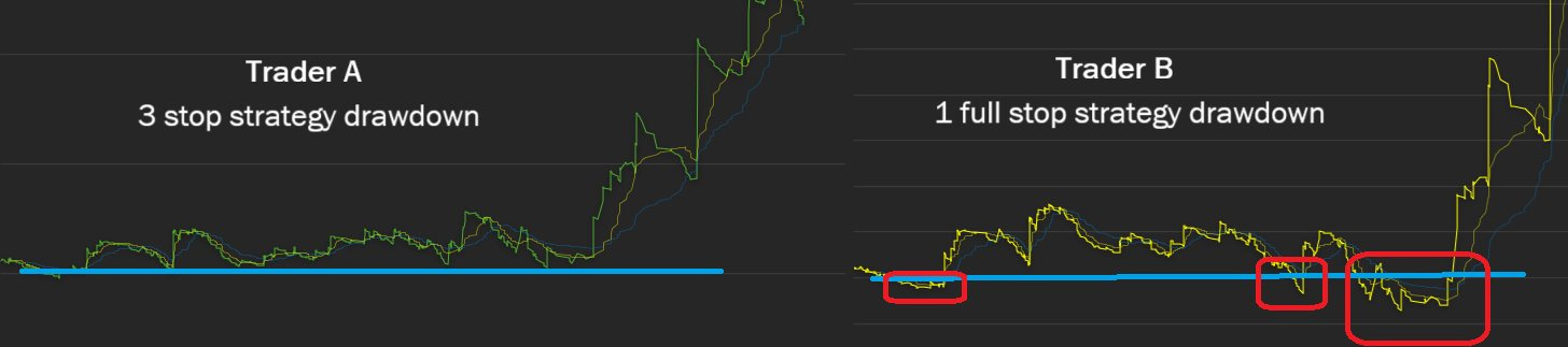 Notice how the drawdown is significantly smaller for the trader using the 3-stop strategy.