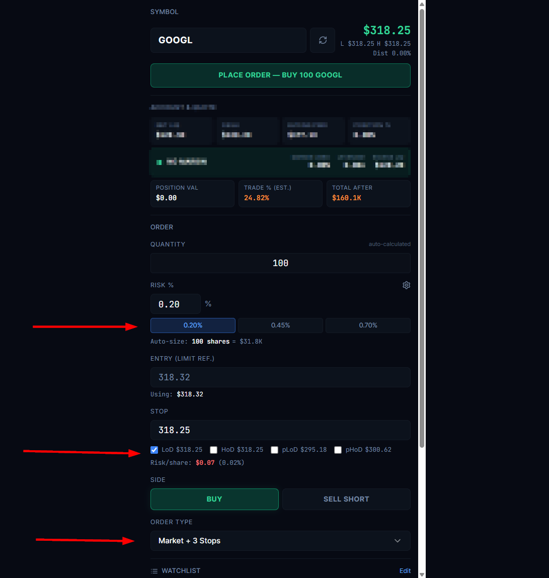 Practically, the platform connects to my broker via an API, pulls market data, calculates my position size based on the risk I choose and my stop level (Low of Day, PLOD, HOD, etc.).
