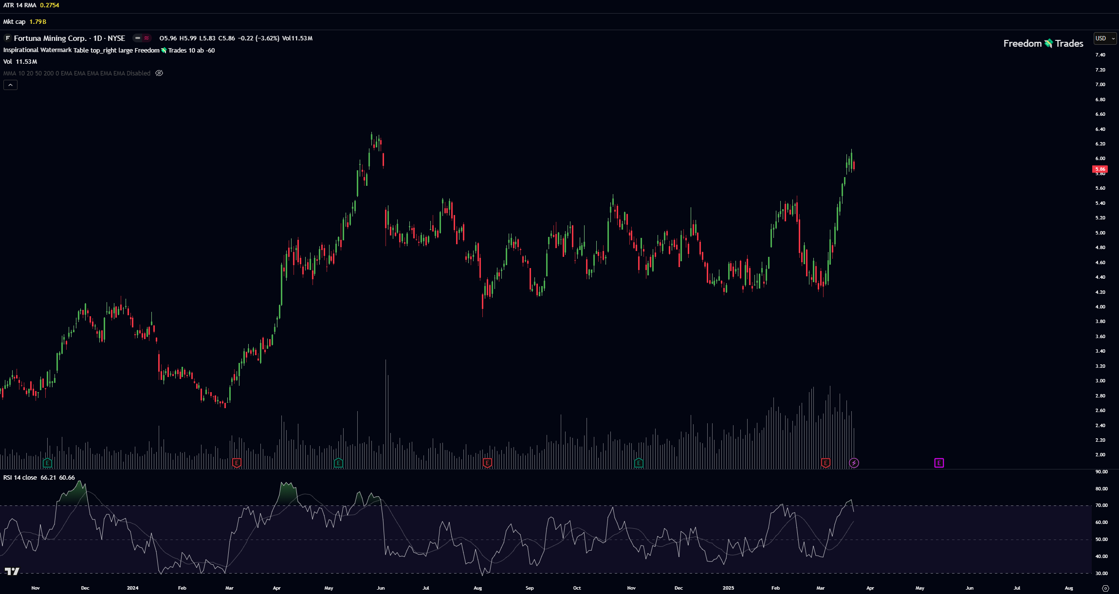 FSM just launched nearly 40% off the lows, driven by a wave of speculative buying following major geopolitical news. Price is now pushing into prior resistance with RSI flashing overbought, and we’re seeing signs of momentum fatigue.