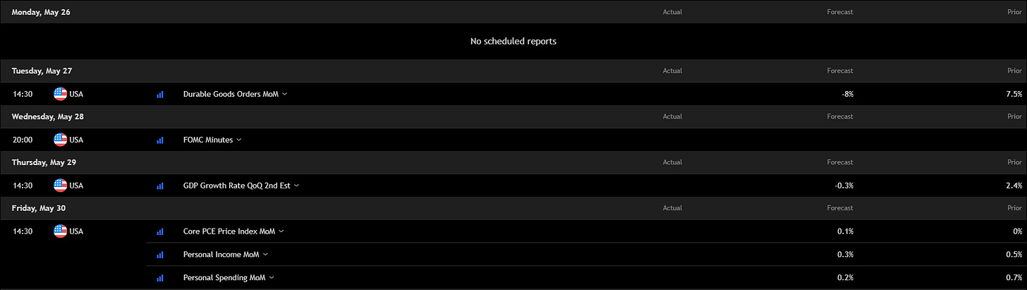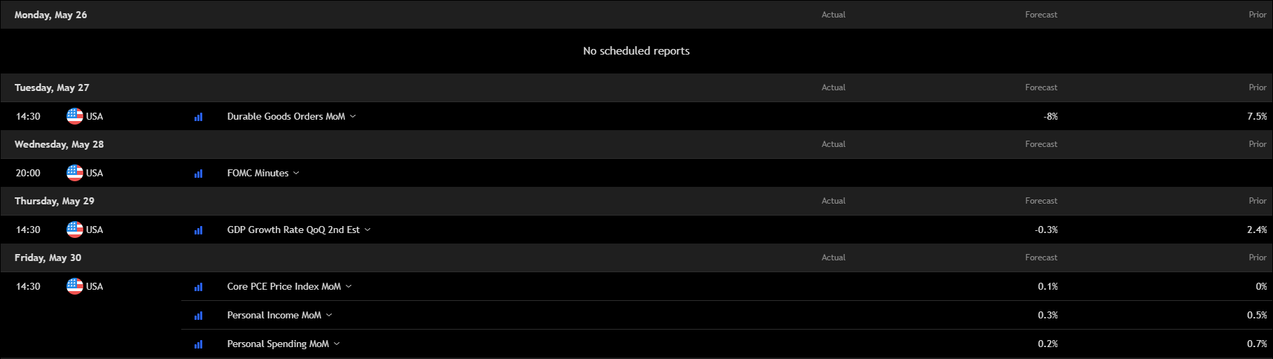 Remember, markets are closed on Monday for Memorial Day in the US, so it’s a short week, but one that is packed with economic reports and earnings announcements.