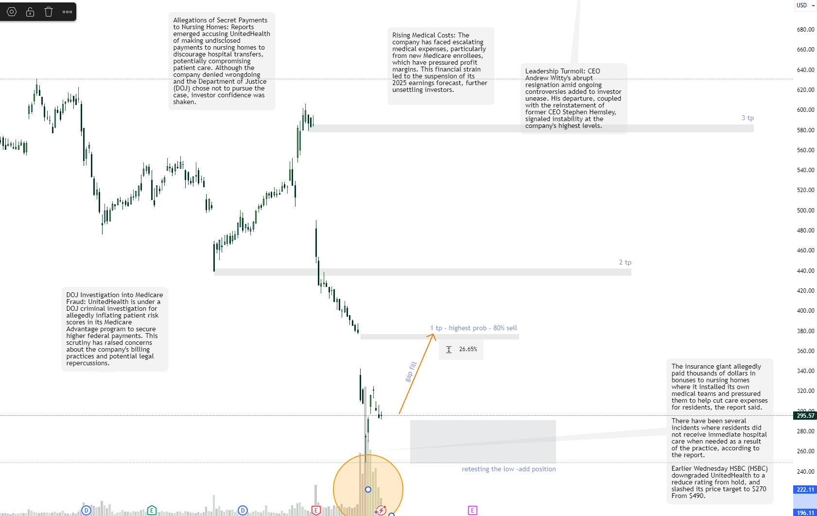 I'm long on UNH 0.00%↑ United Health Group. The chart shows a textbook setup for a high-probability bounce, despite the brutal news cycle. DOJ investigations, nursing home scandal, CEO resignation, it’s all triggered a deep selloff, but what matters now is the reaction, not the headlines.