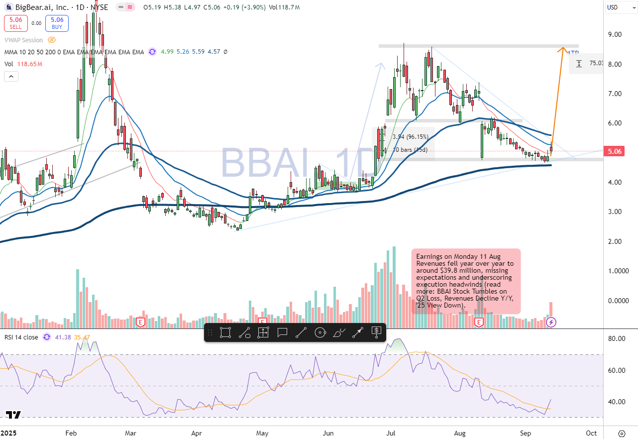 BBAI seems to have formed a small support zone around $4.50 – $5 and bounced off the 200 EMA. Volume has also been increasing over the past two days, and RSI is oversold.