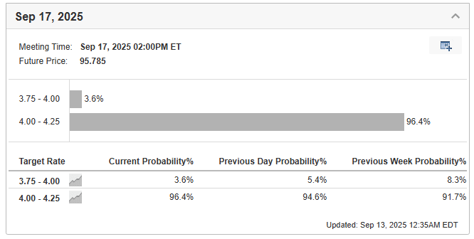 Markets are pricing in a near-certainty of a rate cut, with a 96.4% chance of a quarter-point reduction.