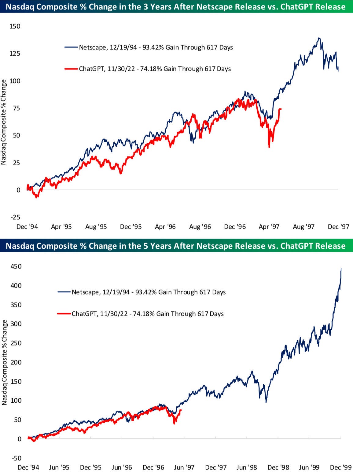 The Nasdaq’s performance after the release of ChatGPT is mirroring the post-Netscape boom almost step for step.