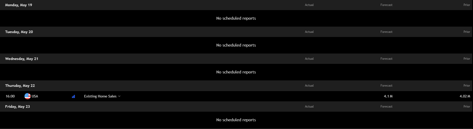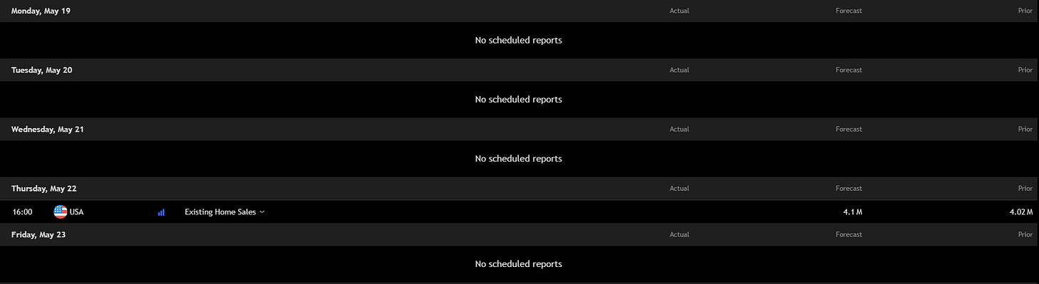 Quiet week ahead, only notable release is U.S. Existing Home Sales on Thursday. Price action will likely be choppy unless we get a surprise catalyst.