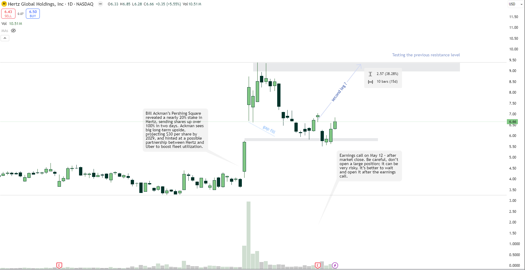 Still holding the position according to plan. Price is showing strength after consolidating and bouncing off the gap-fill zone. As long as it stays above that 5.50 - $6 area, the setup for a second leg toward the $9 resistance remains valid.