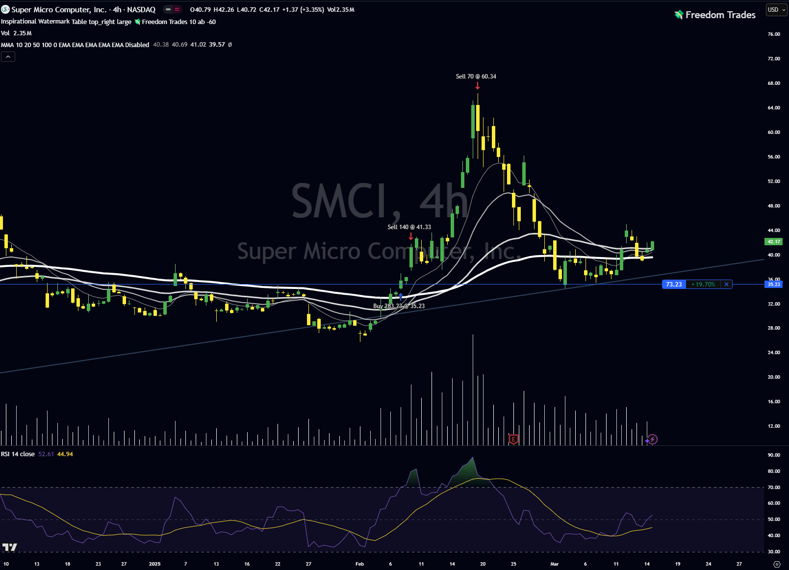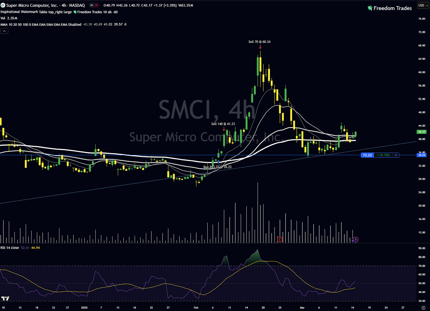 Super Micro Computer (SMCI) is showing signs of strength after a healthy pullback. Price is holding above key moving averages, and we’re seeing a potential higher low forming near trendline support. The RSI is curling up, indicating renewed momentum.
